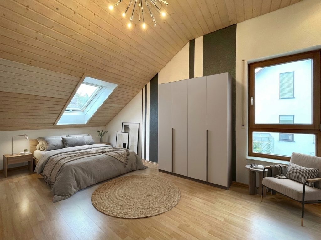 Das Schlafzimmer überzeugt mit großzügiger Fläche, hellem Ambiente und beeindruckender Deckenhöhe, die ein Gefühl von Offenheit und Leichtigkeit vermittelt. Ein weiteres universell nutzbares Zimmer bietet Ihnen die Freiheit, es ganz nach Ihren Wünschen zu gestalten – sei es als Kinderzimmer, stilvolles Homeoffice oder gemütlicher Rückzugsort.